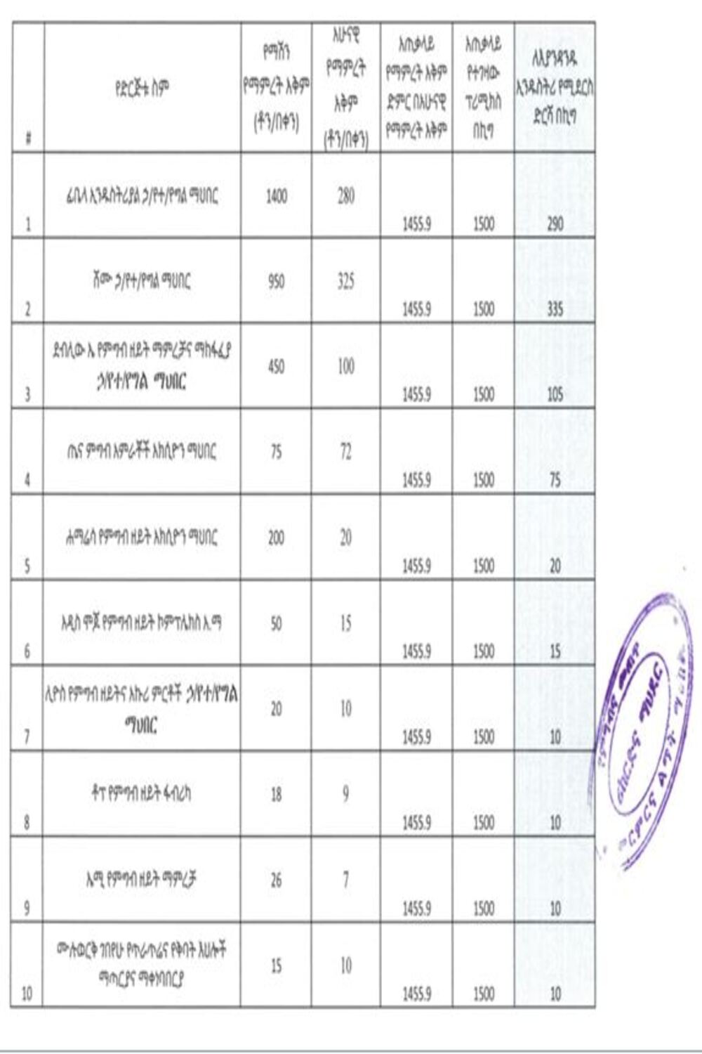We respectfully inform you that you can take the Premix quota assigned to your company starting from October 24/2023 from the Central district of our enterprise located in Kality , Based on the following quota list.